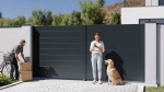 Votre portail est réglé pour s’ouvrir manuellement. Une alternative de motorisation est proposée, aisément montable avec une traverse basse renforcée verticale et une finition spécifique qui substitue la poignée pour un design minimaliste. Les options de motorisation sont affichées à droite.