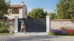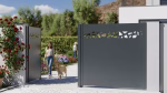 Votre portail est configuré pour s’ouvrir de manière manuelle. On propose une option de motorisation facile à installer, accompagnée d’une traverse basse renforcée verticale et d’un design minimaliste qui remplace la poignée par une finition spécifique. Les choix de motorisation sont présentés sur le côté droit.